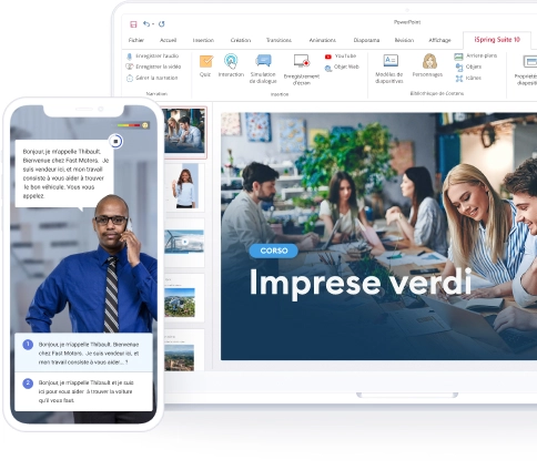 L’editor integrato in Moodle non è l’unico strumento che puoi sfruttare per fare i corsi per Moodle. Hai anche la possibilità di usare il toolkit iSpring Suite, un potente add-in di PowerPoint che ti permette di creare un corso e-learning interattivo velocemente e in un ambiente familiare. Puoi richiedere subito una demo di 30 minuti per scoprire come fare.
