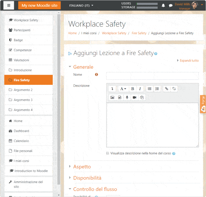 Per inserire un argomento in un corso devi modificare il nome dell’argomento. Per il nostro corso di esempio, modifica il nome da Argomento 1 a Sicurezza antincendio poi, fai clic su Aggiungi una attività o una risorsa al creatore di corsi. Sullo schermo apparirà la barra multifunzione di Moodle. Scegli Lezione nella sezione Attività e fai clic su Aggiungi.