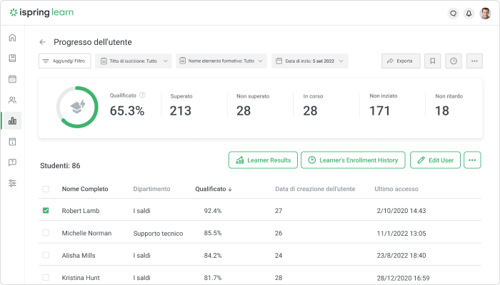 iSpring LMS è la piattaforma ideale per gestire l’onboarding dei nuovi assunti, offrire formazione, monitorare le prestazioni e gestire l’accesso ai corsi per il personale interno o i collaboratori da remoto.