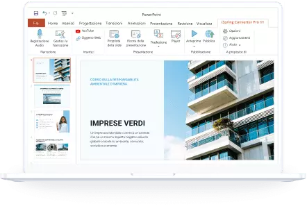È fantastico avere la funzione di conversione inclusa in PowerPoint, ma abbiamo scoperto che gli intervalli delle transizioni delle slide in un video convertito in questo modo potrebbero essere disattivati. Se vuoi che gli effetti di PPT rimangano invariati in una video presentazione, scarica una prova gratuita di iSpring Converter Pro. Con questo programma potrai convertire le tue diapositive PowerPoint in video e ottenere una presentazione MP4 di grande qualità che mostra tutti gli effetti e le animazioni originali e mantiene intatti gli intervalli.