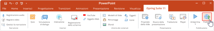 Arrivati nella sezione di iSpring Suite di PowerPoint, dovete raggiungere l’opzione Pubblica. Come potete vedere nell’immagine qui sotto, si trova sulla destra, poco sotto la voce di iSpring Suite.