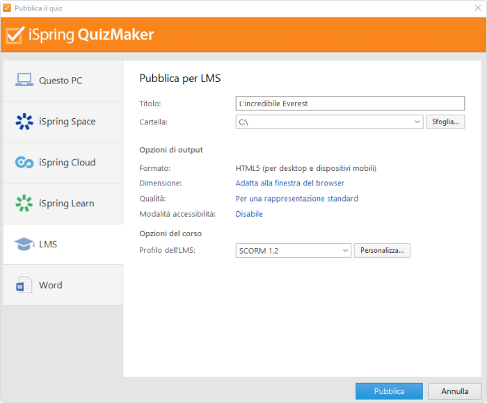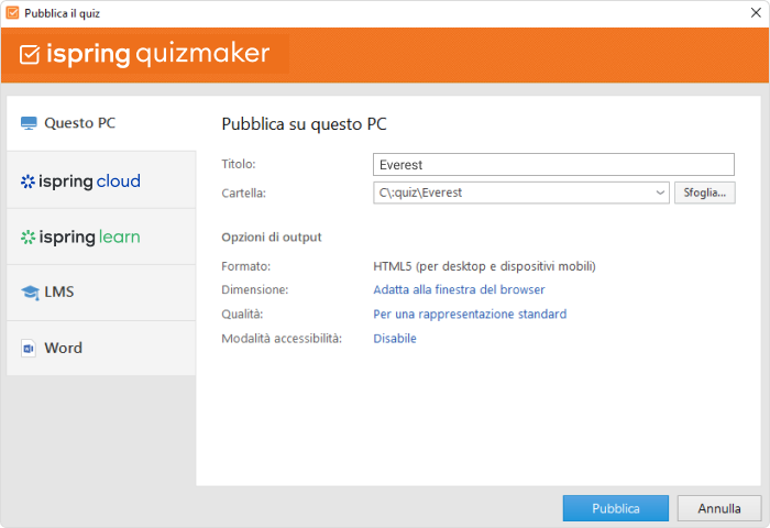 Quando hai finito di creare un quiz, puoi pubblicarlo in HTML5, per consentire ai tuoi studenti di visualizzarlo nei browser web o sui dispositivi mobili, o in qualsiasi formato eLearning per caricarlo in un LMS, inclusi SCORM 1.2 e 2004, AICC, xAPI e cmi5. Puoi anche salvare il tuo quiz come documento Word per stamparlo e consegnarlo come test cartaceo.