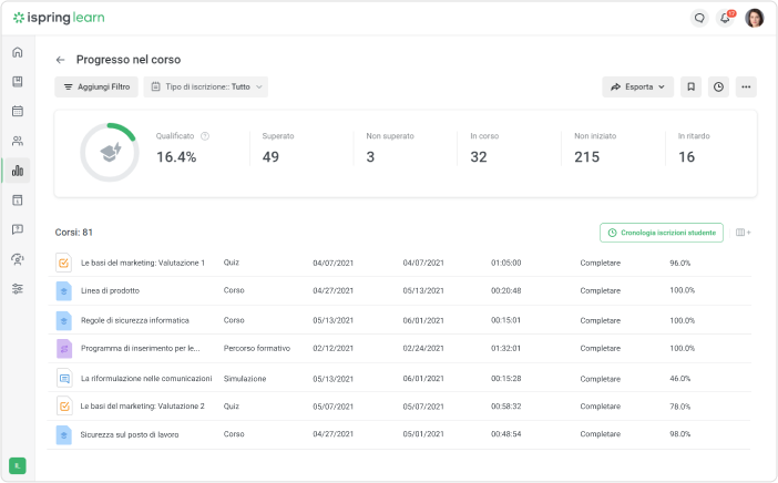 Progresso dello studente in iSpring LMS